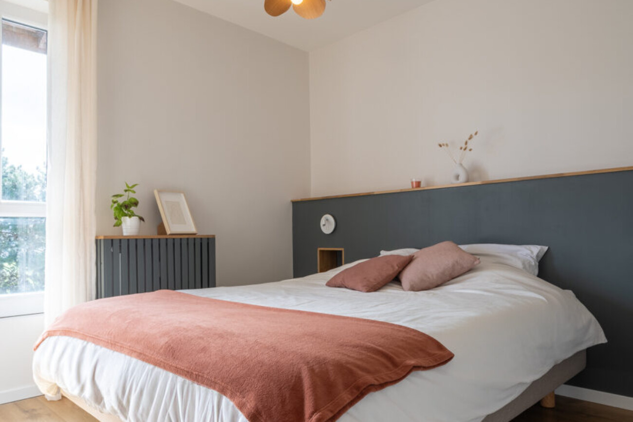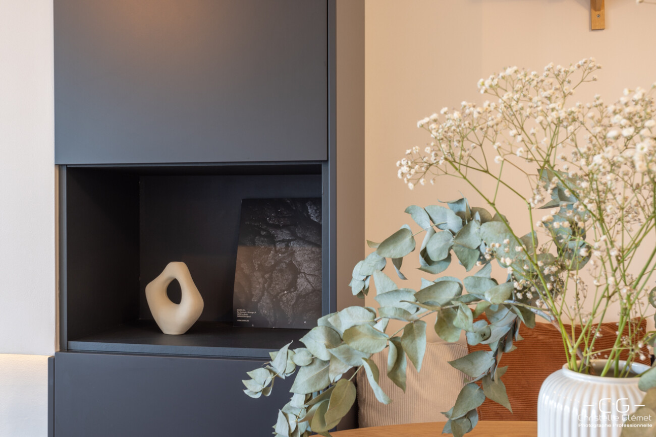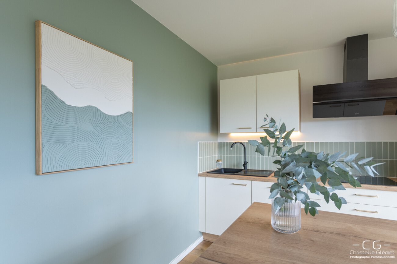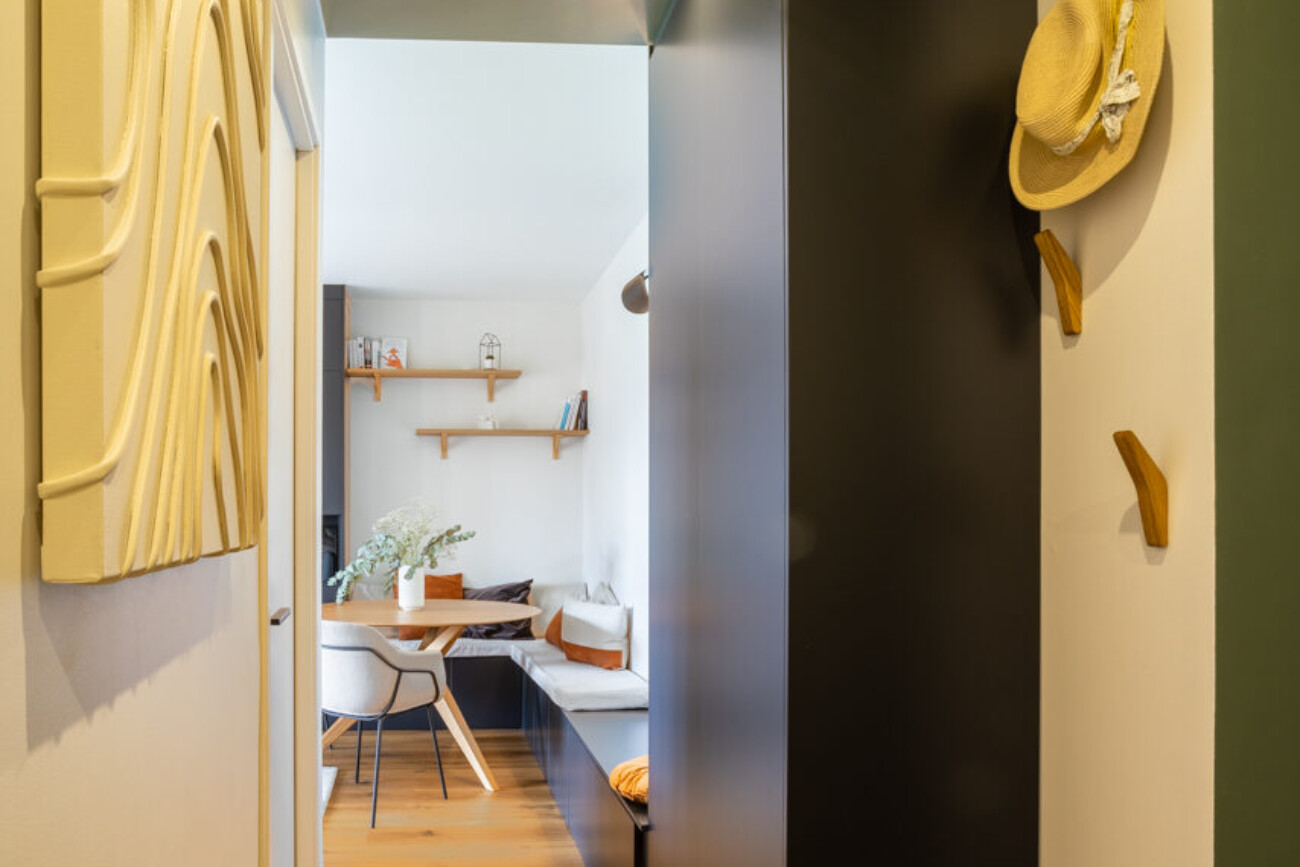 Quoi de plus inspirant qu’une belle vue sur les montagnes ? Dans cet appartement des années 70, les propriétaires souhaitaient recréer de la circulation entre chacune des pièces et rendre l’appartement plus lumineux afin de profiter de la vue et de la lumière naturelle. Pour cela, certaines portes, devenues inutiles ont été supprimées, comme celle entre la cuisine et le salon, désormais communicants. On y retrouve du bois, des dessins esquissés au crayon de bois, des plantes, du vert, de l’ocre. Une décoration directement inspirée des couleurs et matières de la nature.