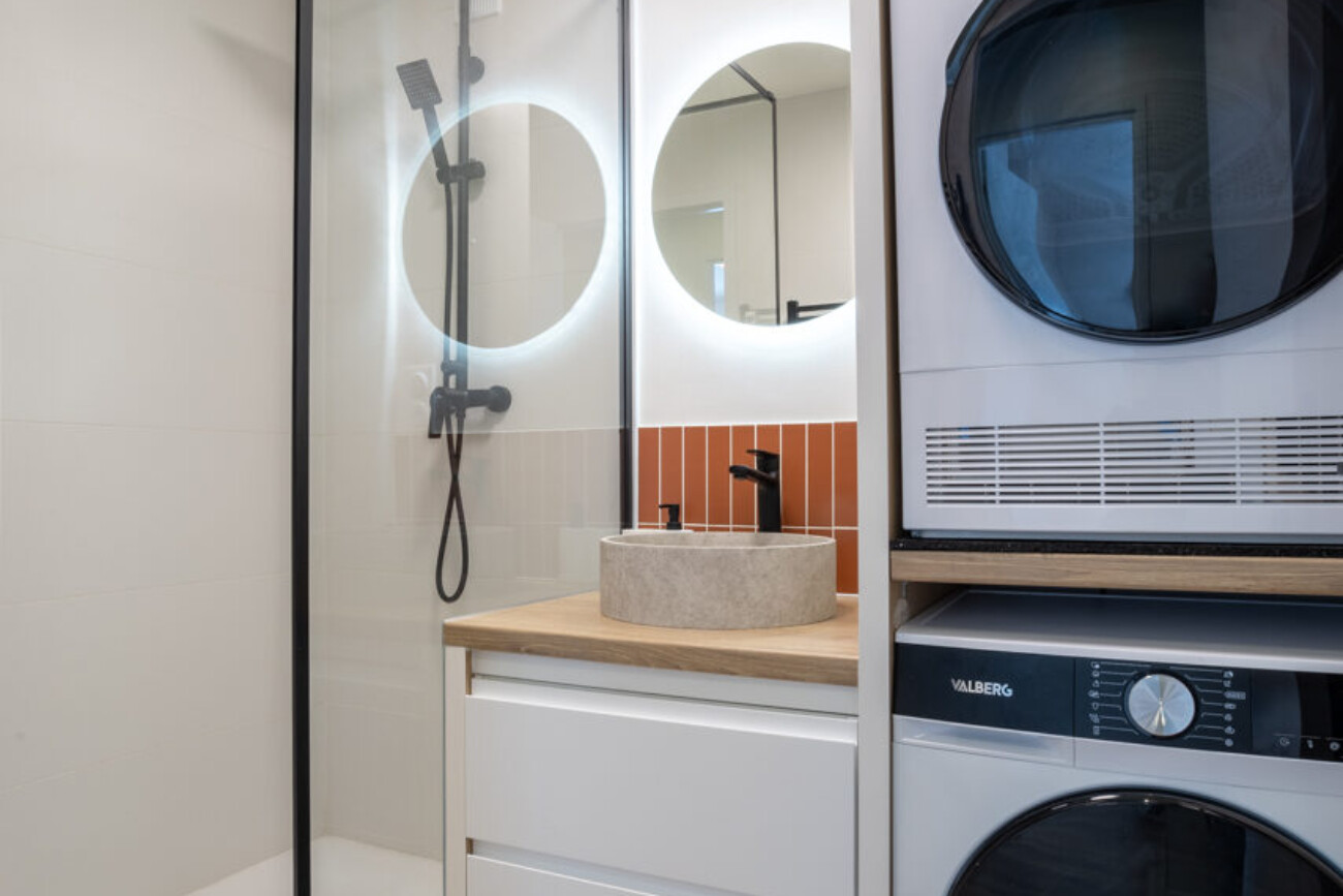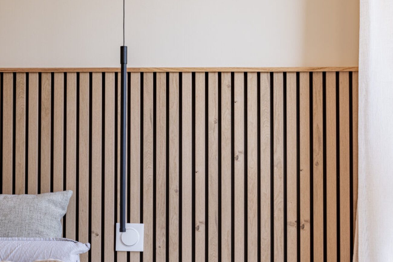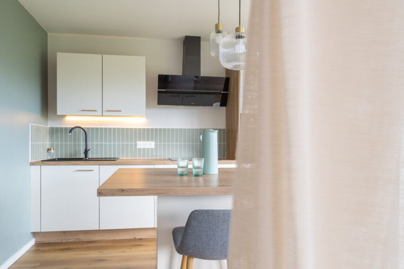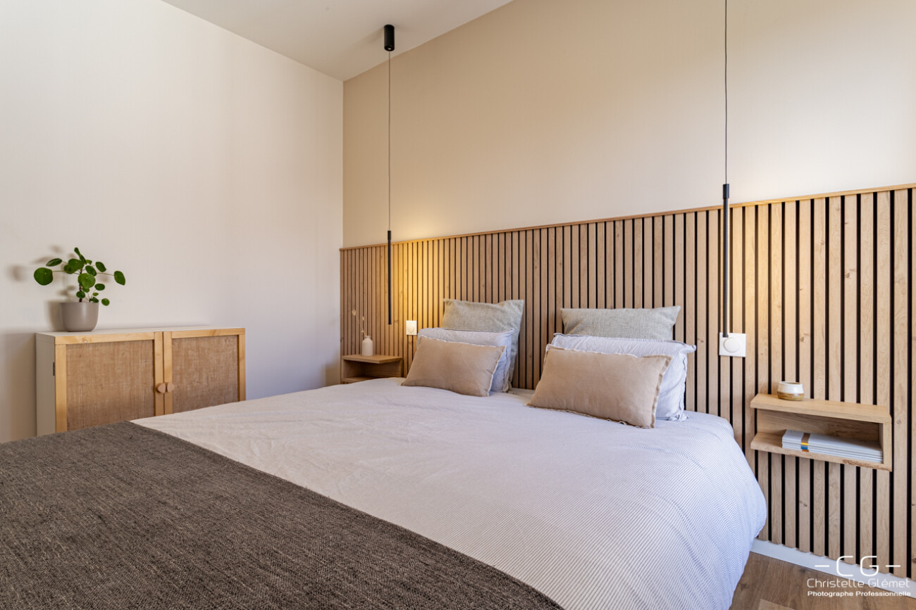 Quoi de plus inspirant qu’une belle vue sur les montagnes ? Dans cet appartement des années 70, les propriétaires souhaitaient recréer de la circulation entre chacune des pièces et rendre l’appartement plus lumineux afin de profiter de la vue et de la lumière naturelle. Pour cela, certaines portes, devenues inutiles ont été supprimées, comme celle entre la cuisine et le salon, désormais communicants. On y retrouve du bois, des dessins esquissés au crayon de bois, des plantes, du vert, de l’ocre. Une décoration directement inspirée des couleurs et matières de la nature.