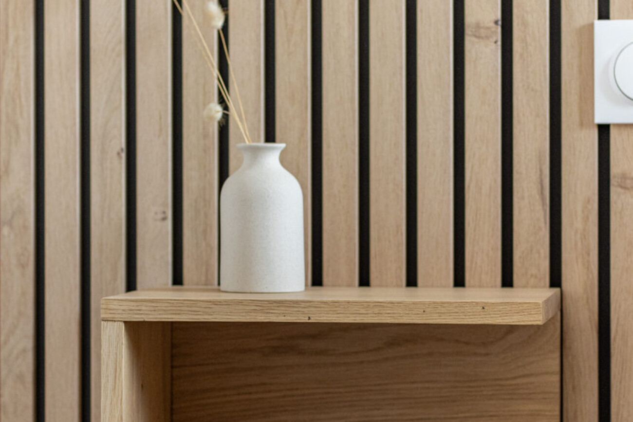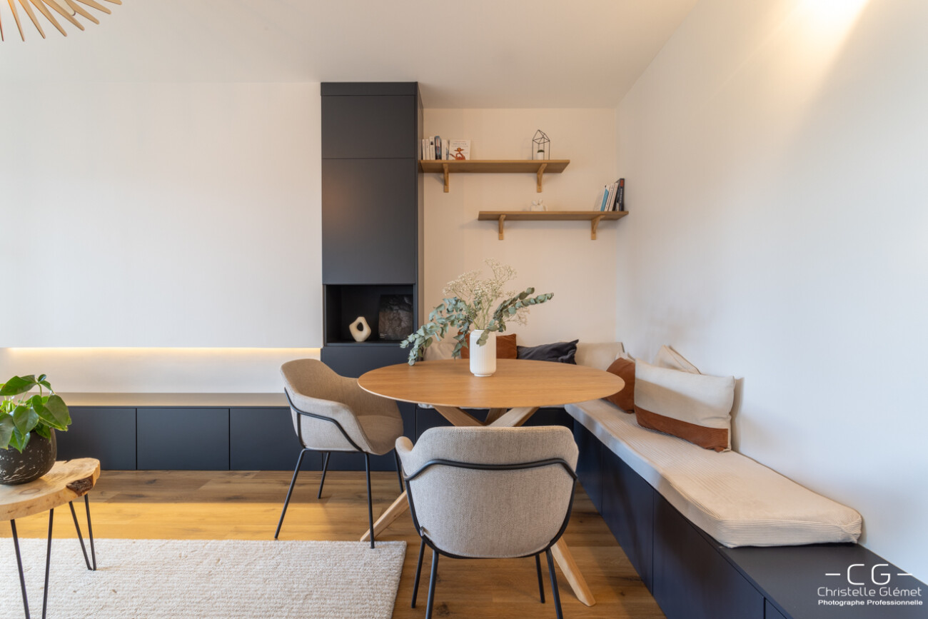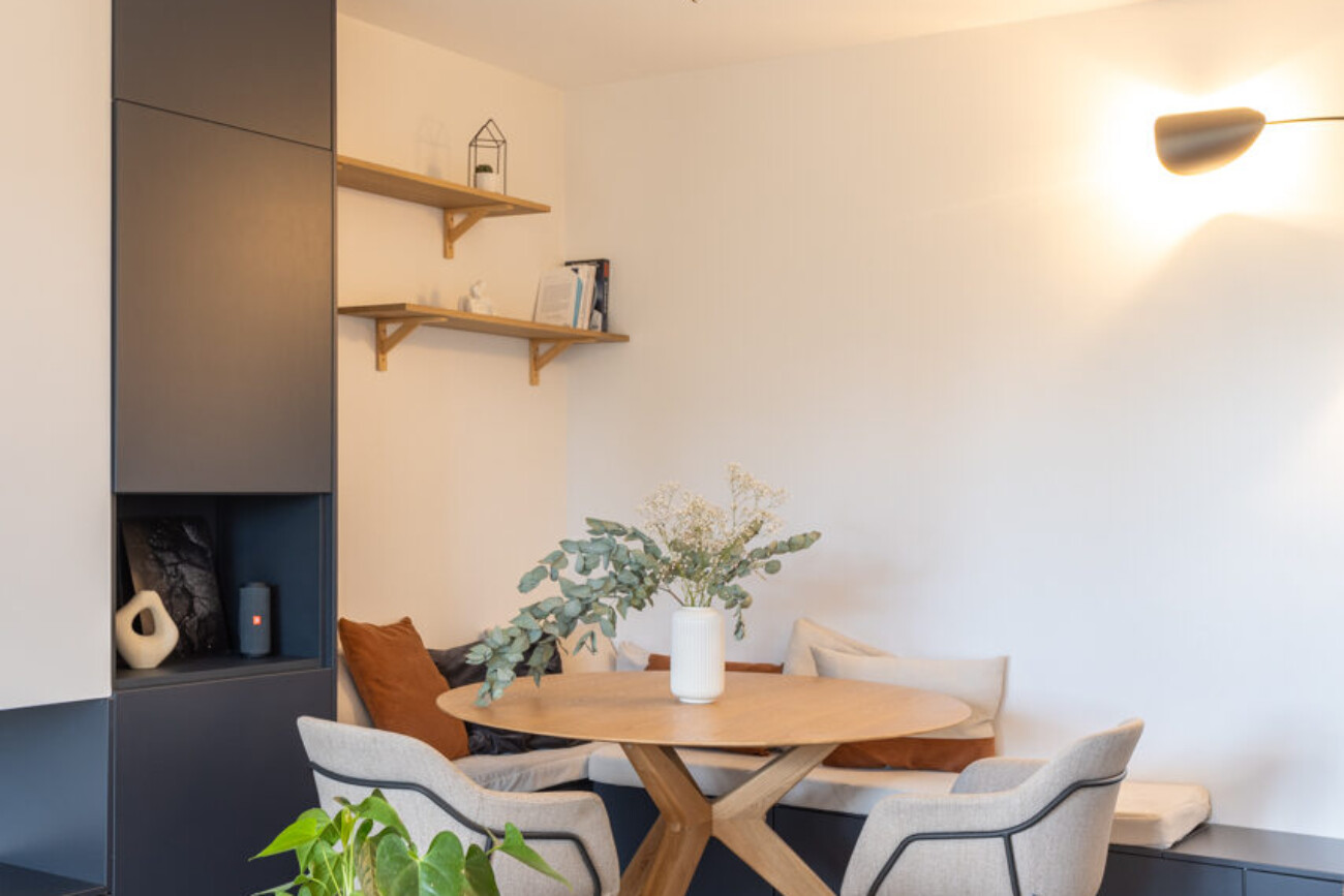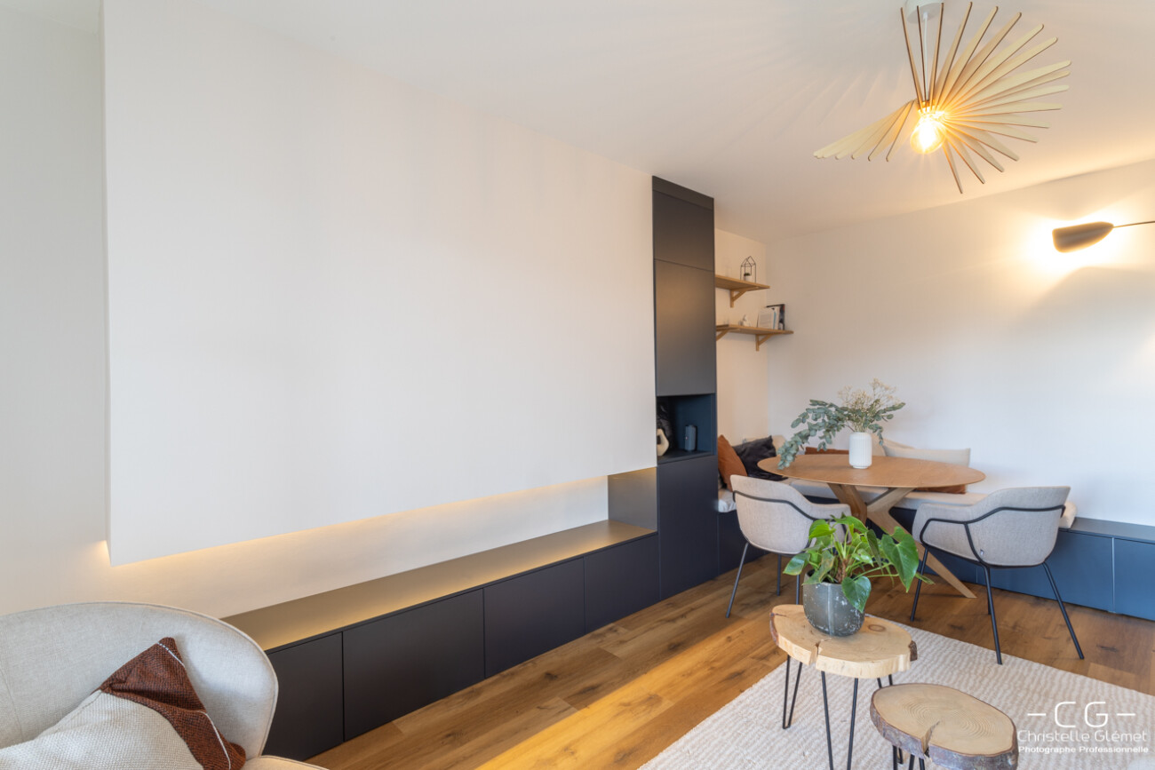 Intégrer de nombreux rangements intelligents pour créer un salon et un coin salle à manger, dans une atmosphère douce et chaleureuse.