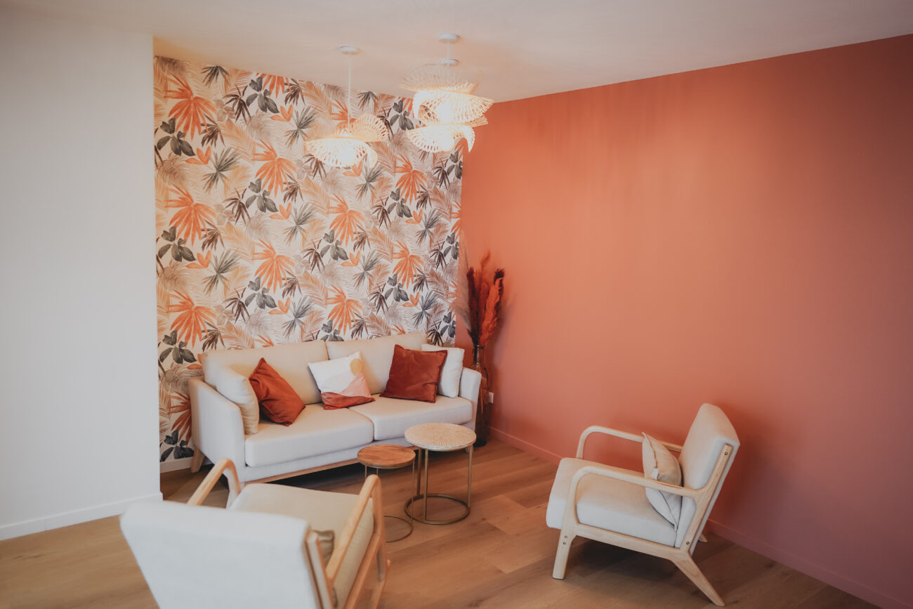 Lors de la visite conseil, nous avons discuté des idées précises de ma cliente concernant l’ambiance et les couleurs souhaitées pour son espace de coaching. Le point de départ : le terracotta ! Une belle couleur qui figure sur nos logos respectifs. Une couleur parfaite pour un espace accueillant, qui inspire une force douce, un cocon chaleureux où passer un moment. Dans le cadre du coaching déco, j’ai évalué les contraintes techniques et lui ai proposé des solutions adaptées pour optimiser l’agencement de son mobilier et l’utilisation de l’espace. Le dessin à la main a permis de mettre en évidence le choix de couleurs et l’organisation de l’espace. Nous avons pu déterminer quelles références peintures utiliser, et où placer la couleur dans la pièce !