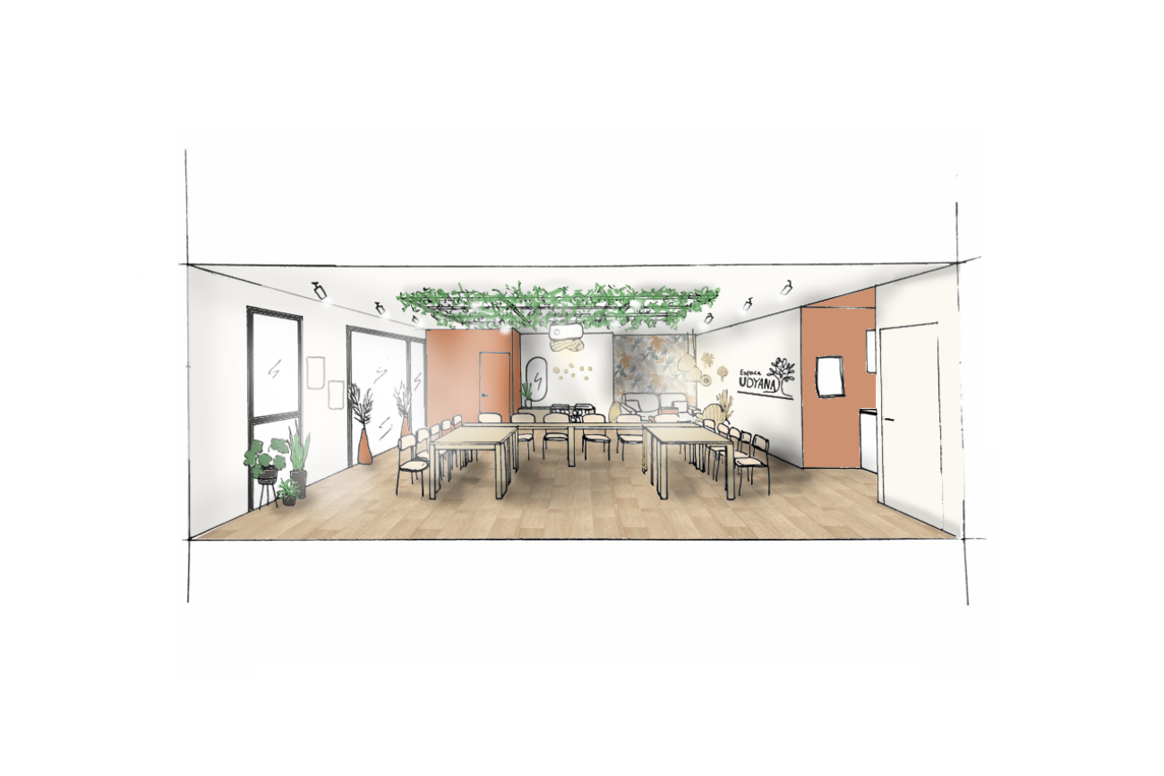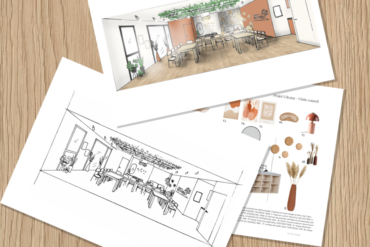 Pour accompagner l’Espace Udyana dans la concrétisation de son espace de coaching, nous avons débuté par une visite conseil sur place. Ma cliente avait une vision précise de l’ambiance qu’elle souhaitait instaurer, notamment un coin cocooning pour des échanges informels. Elle souhaitait valider l’emplacement des couleurs, obtenir des conseils pratiques et techniques, et disposer d’un support visuel pour communiquer son projet aux banques, institutions et futurs partenaires coachs. J’ai donc réalisé un dessin détaillé de l’espace, mettant en évidence les choix de couleurs et l’agencement proposé.