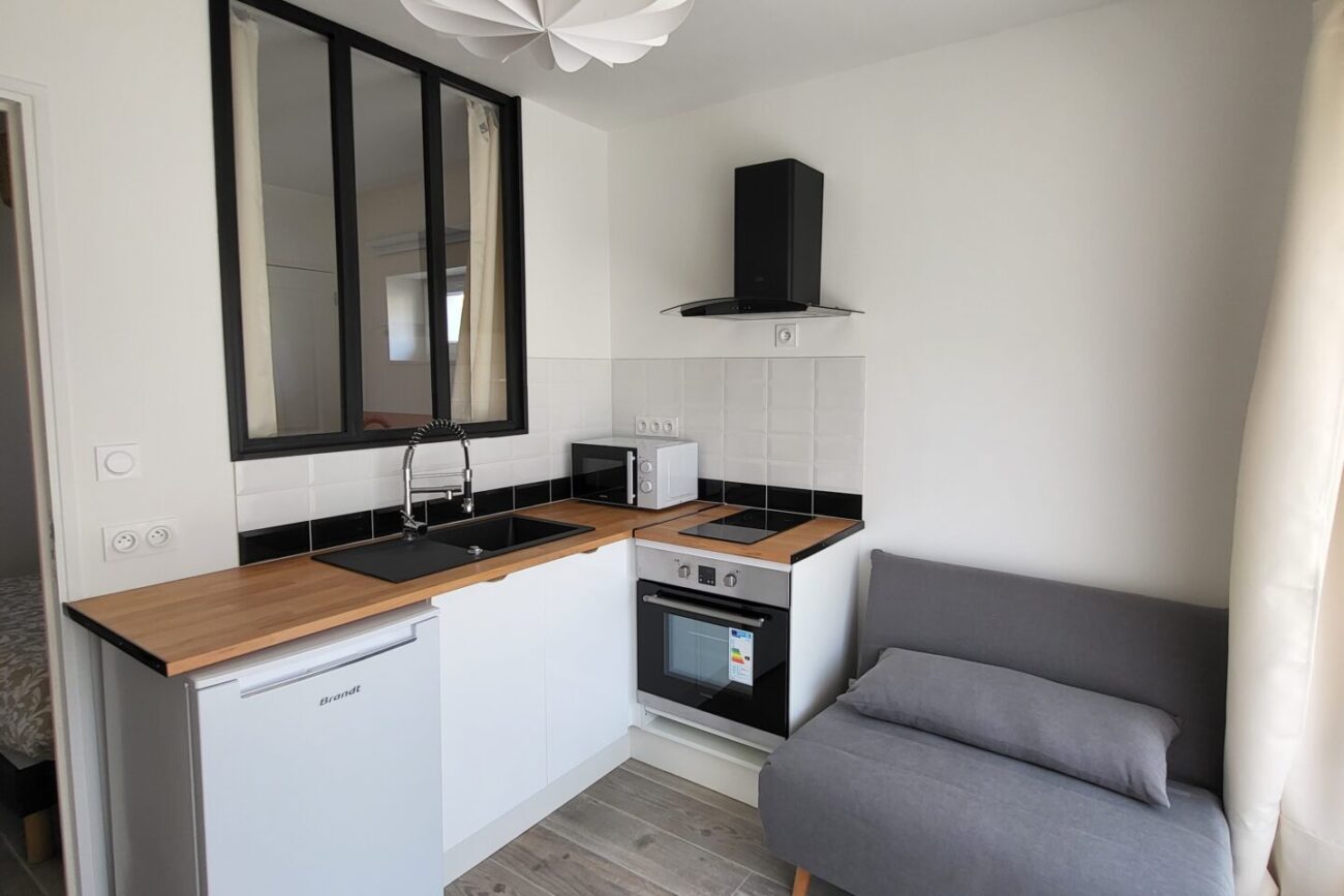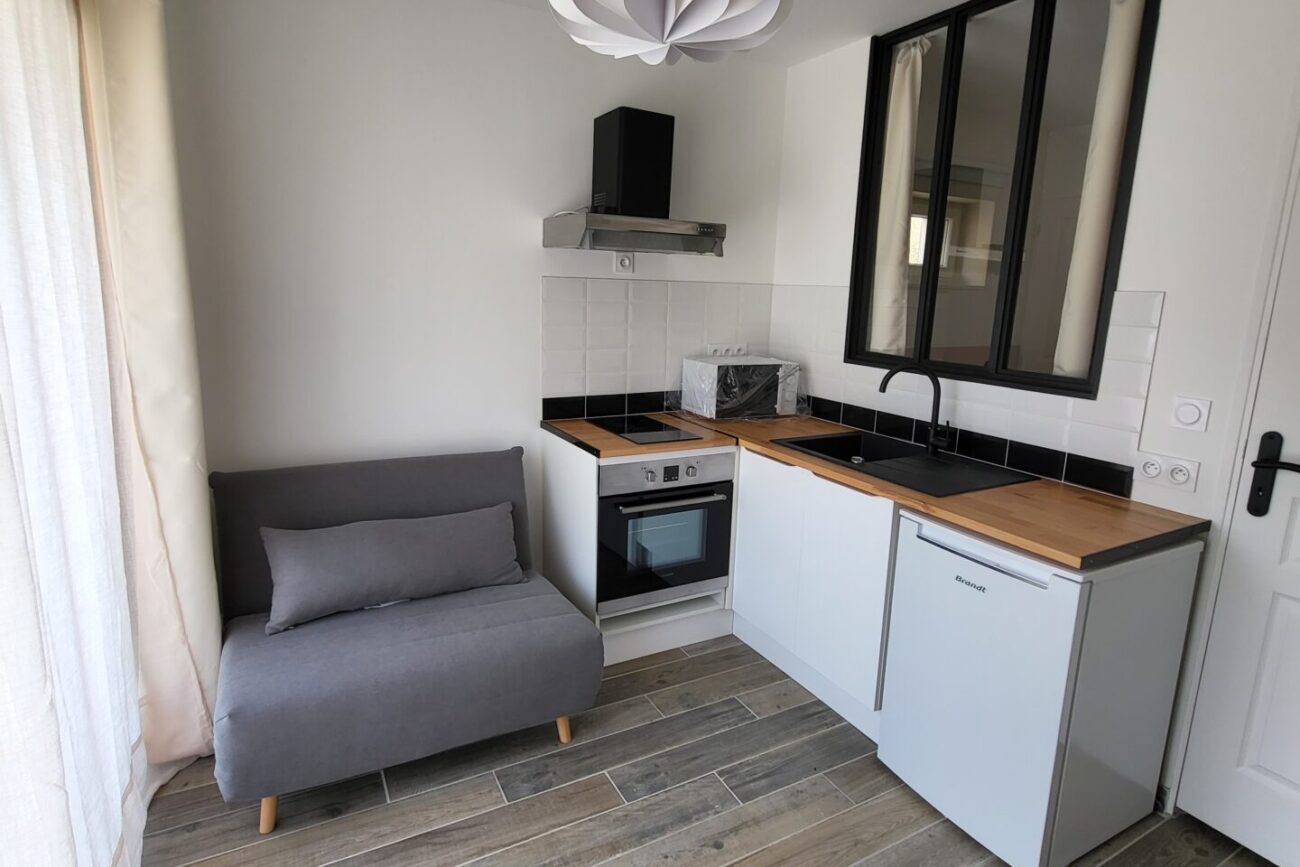 Aménagement complet d’un garage en T1 bis avec chambre séparée, intégrant une cuisine équipée, une salle de bain optimisée. Le tout dans un style industriel et chaleureux.
