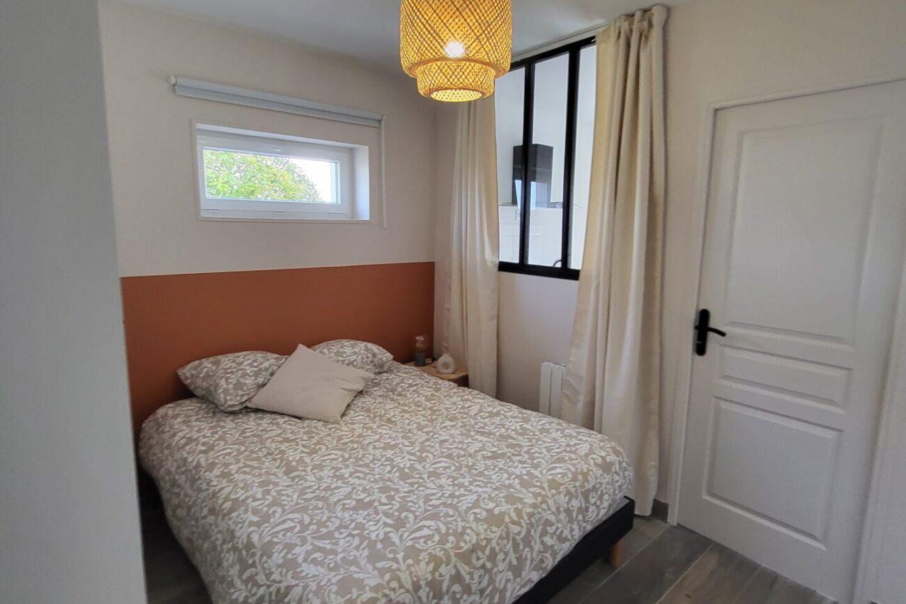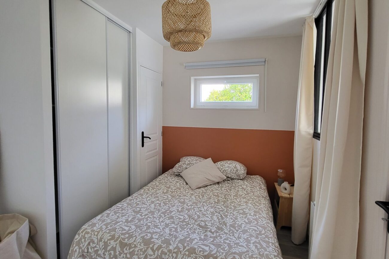 Côté nuit, la chambre séparée se démarque avec une tête de lit peinte en orange terracotta, créant une atmosphère cosy et élégante. La salle de bain s’habille de tons ocres, renforçant l’unité du design.