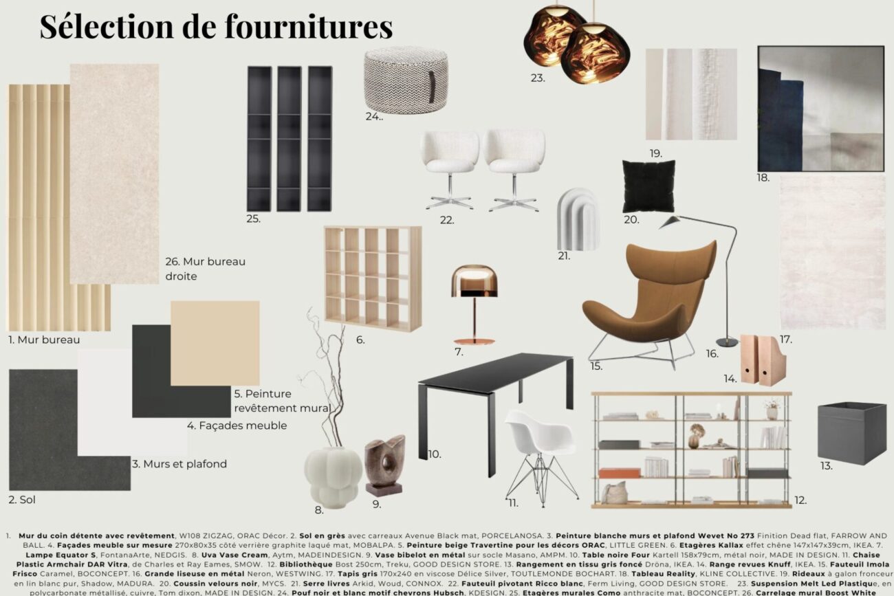 Création d’un bureau de 17,5 m² pour un photographe professionnel. Allier esthétisme et ergonomie n’est pas toujours simple. Pari relevé avec ce bureau élégant et contemporain. On joue avec le clair-obscur, les contrastes, des matériaux naturels et des meubles iconiques, pour un résultat 100% personnalisé, en écho aux jeux de lumière en photographie. Le bureau a été conçu pour offrir un espace de travail à la fois fonctionnel et inspirant. Les lignes épurées et modernes du mobilier se marient harmonieusement avec des touches de bois chaleureux et des accents métalliques pour créer une ambiance sophistiquée et accueillante.